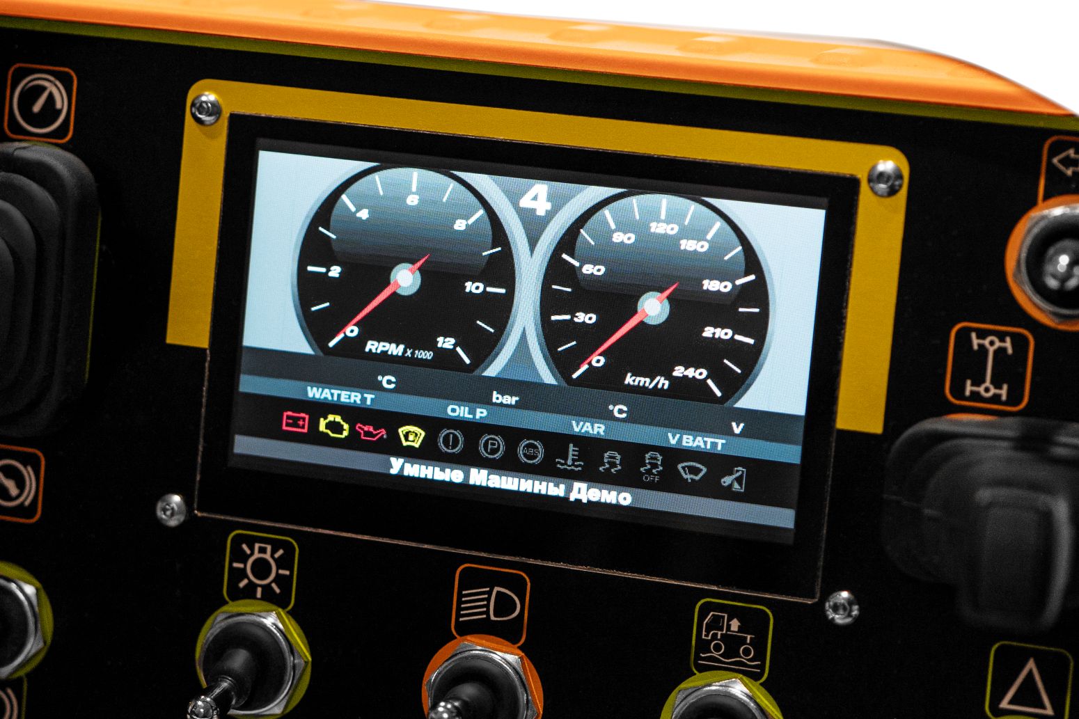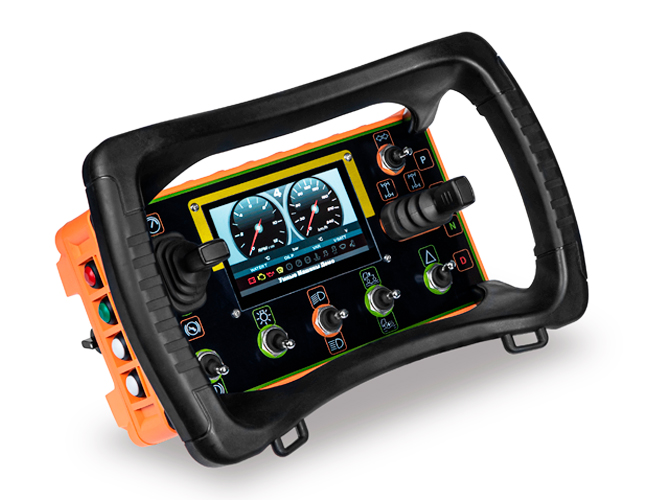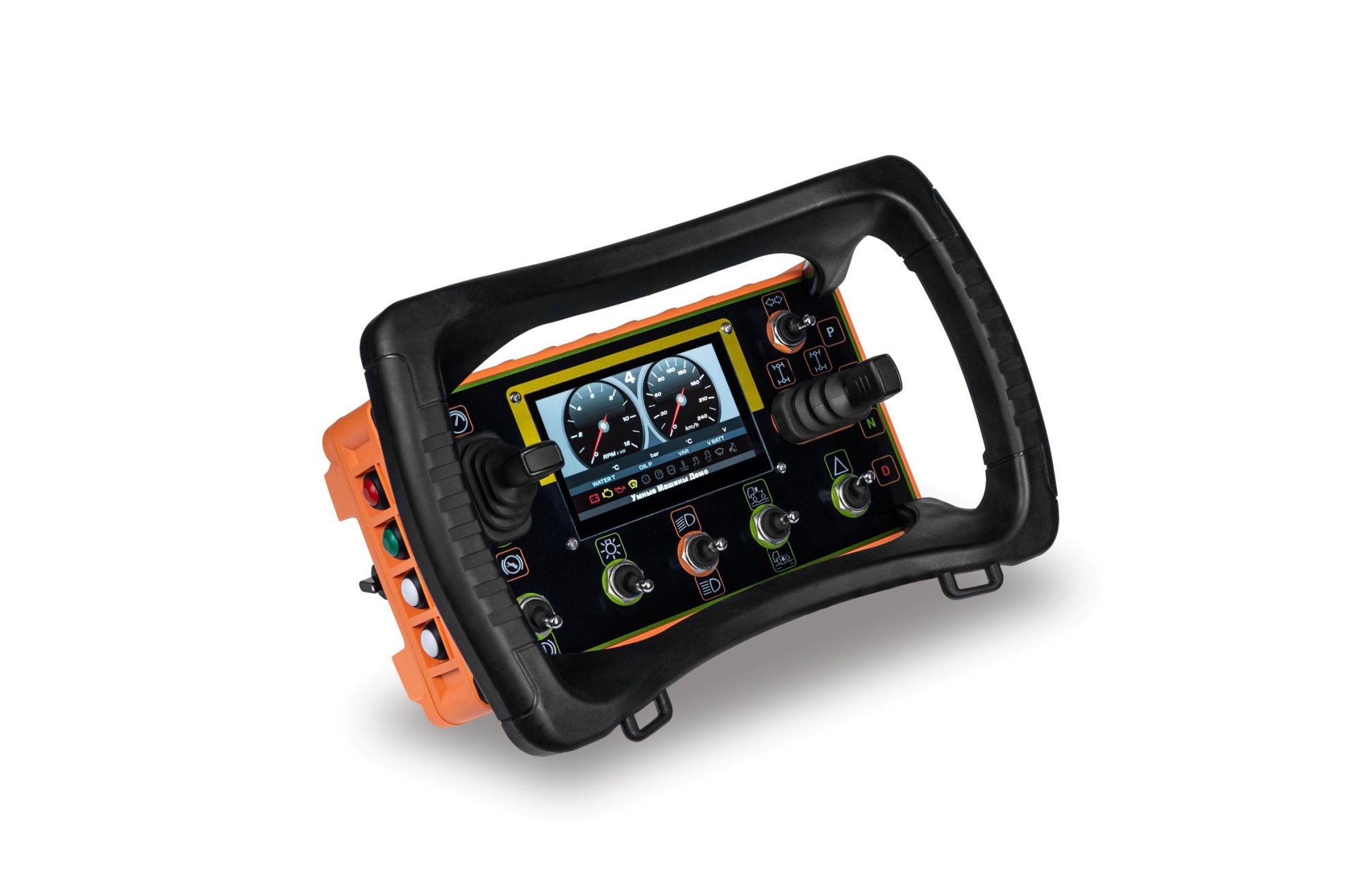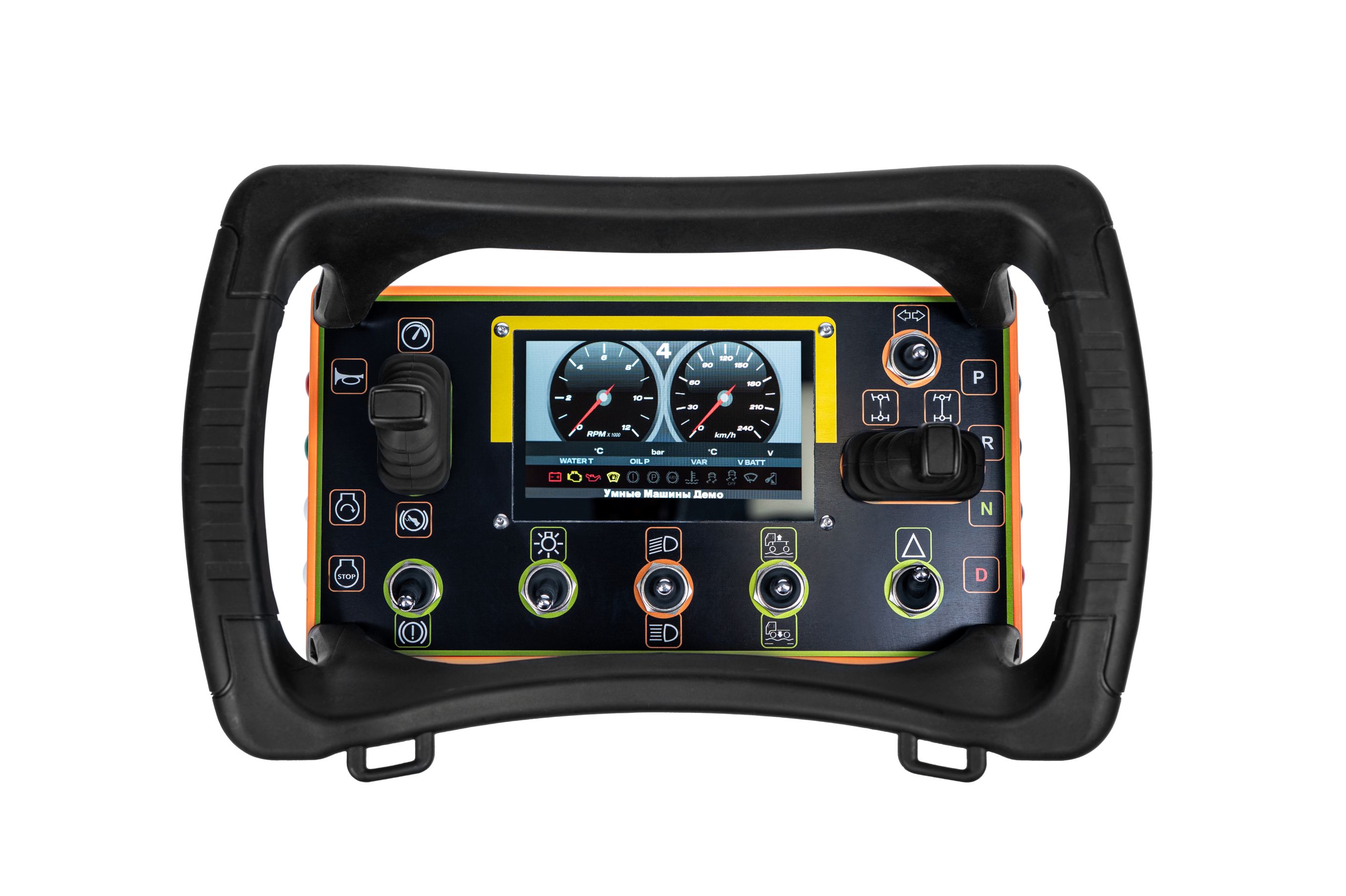 предназначен для управления автомобильной техникой и отображает ключевые параметры шины CAN автомобиля. На передней панели расположены два линейных джойстика: один для управления педалью газа и тормоза, другой — для поворота колес влево и вправо. Кроме того, пульт позволяет переключать режимы автоматической коробки передач.
